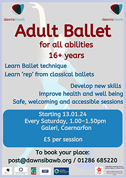regular ‘seated dance’ sessions for people aged 60 years and over in partnership with Porthi Dre, Caernarfon. Taking place every other Monday 10.30-11.30 at Ty Seiont. Contact Porthi Dre for details - 01286 532222